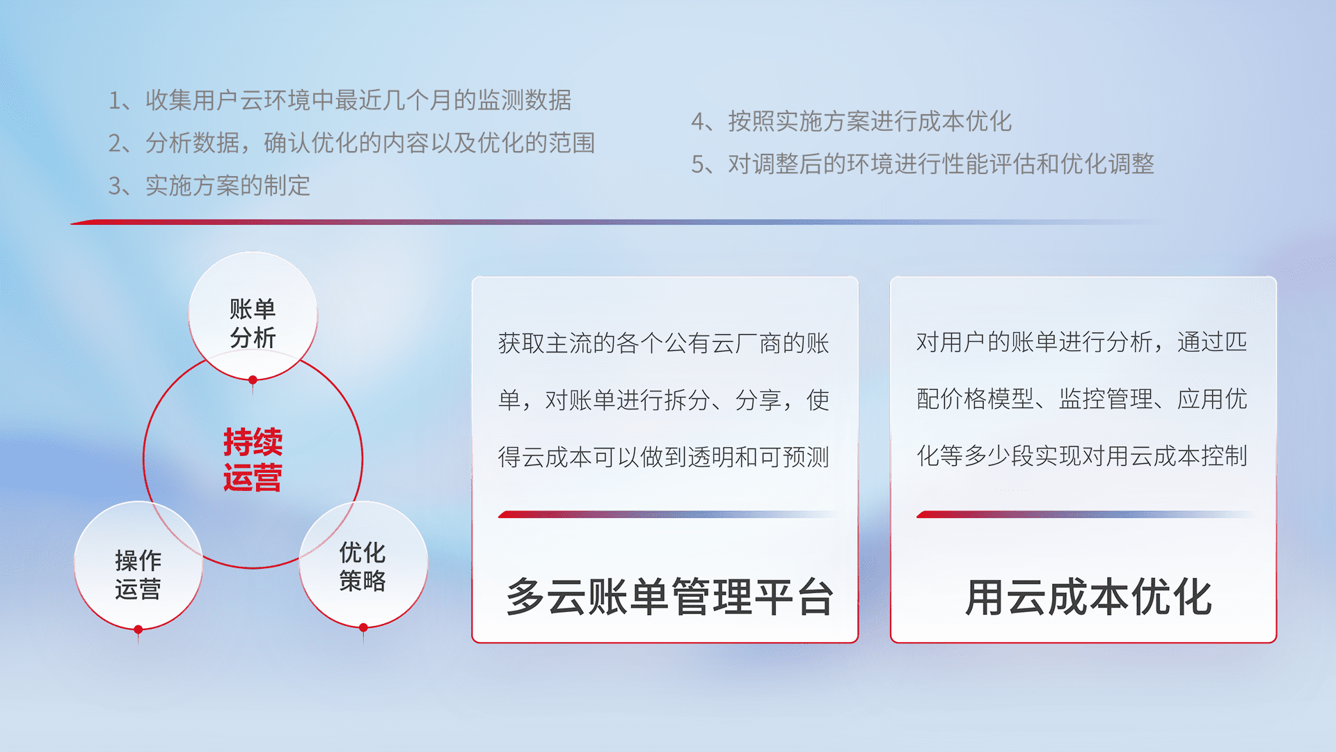 通过多云纳管,,以统一的资源数据模型把客户的云资源进行抽象和封装,,,进而实现对多云资源的统一操作,,保障云资源管理的可靠性、、稳定性与可用性。。。量身定制化运维内容,,,配置、、、、开发运维、、、、补丁管理、、备份、、监控、、认证和访问管理、、、、审计和日常巡检等,,保障在用云过程中的可靠度,,稳定度以及高可用率。。。。